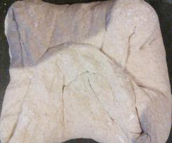 Den Teig auf eine leicht gemehlte Arbeitsfläche geben und ein paar mal falten. Hierbei wird das Brot zum Rechteck gedrückt und dann die Linke und Rechte Seite zur Mitte gefalten. Das sollte dann wieder wie ein kleineres Rechteck aussehn. Dann die obere und die untere Seite zur Mitte hin falten. Was wiederum ein noch kleineres Rechteck ergibt. Dann wieder die Rechte und die Linke Seite nach innen falten. Habe diesen Schritt mit ein paar Bildern dokumentiert (das klingt komplizierter als es ist).