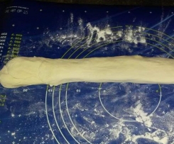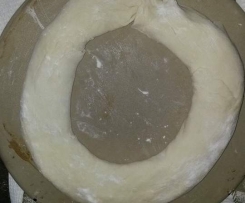 Nun diesen Laib zu einem Ring legen und mit Mehl bestäuben, auf ein Backblech oder Stein geben.