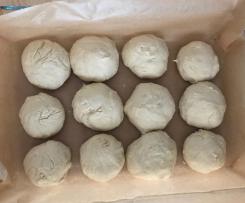 - Den Teig auf der bemehlten Arbeitsfläche durchkneten und mit bemehlten Händen 10- 12 Brötchen formen. Die Brötchen in eine mit Backpapier ausgekleideten Auflaufform legen und noch einmal 15 Min gehen lassen.