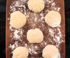 Den fertigen Teig auf bemehlter Arbeitsfläche in 12 gleichgrosse Stücke teilen und zu Kugeln formen.