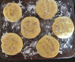 Danach die Teiglinge platt drücken und mit der Ei-Wasser-Milch-Mischung bepinseln, mit Sesamkörner bestreuen.