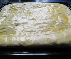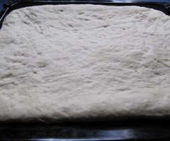 Ei mit Zucker und Olivenöl verquirlen und den Teig damit einpinseln. Ich bereite bei Feiern meistens gleich zwei Bleche zu, dann reicht die Eimischung genau. Bei nur einem Blech bleibt noch etwas übrig. Wer mag, kann jetzt Kümmel oder Sesamkörner auf die Eimischung geben.