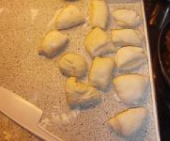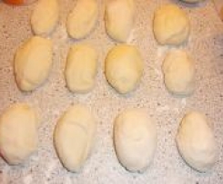 "Mixtopf geschlossen" so lange gehen lassen bis sich der Teig sichtbar vergrößert hat (etwa 30 Minuten)- den gegangenen Teig auf eine bemehlte Arbeitfläche geben und kurz mit den Händen durchkneten und in 12 Portionen teilen