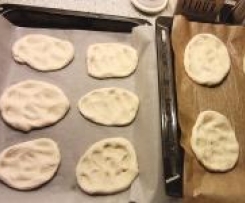 Teigfladen auf die mit Backpapier belegten Bleche legen, mit dem Löffelstiel vertiefungen in die Fladen drücken