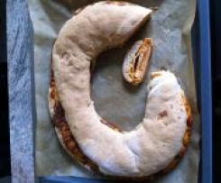 "Linkslauf" verrühren.Teig mit Füllung bestreichen, aufrollen, in U-Form auf das Backblech geben und 10 Min. gehen lassen.