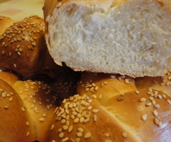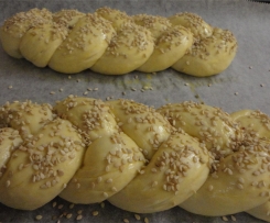Ein Blech mit Brotpapier auslegen und die Zöpfe mit etwas Wasser mit Milch verdünnt bepinseln und mit Sesam Körner bestreuen, zwei stunden gehen lassen.