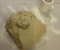 ca. 90 min gehen lassen, dabei alle 25-30 min. den Teig ziehen und falten, d.h. mit einer Teigkarte am Rand tief nach unten fahren und den Teig in die Mitte schlagen, 1/4 Drehung und wdh. bis man eine Runde den Teig gezogen hat. - auf eine bemehlte Arbeitsfläche den Teig stürzen und mehrmals den Teig falten. Achtung! Der Teig ist etwas klebrig. Wenig Mehl verwenden zum falten, damit der Teig nicht an der Arbeitsfläche klebt.