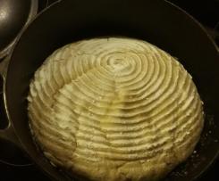 - Eine halbe Stunde vor Ablauf einen Gußeisentopf bei 240 Grad Ober- und Unterhitze aufheizen. Dann den Brottopf leicht fetten und den Brotteig in den heißen Topf stürzen, Deckel aufsetzen und das Brot ca 1 Std. backen.
