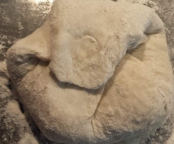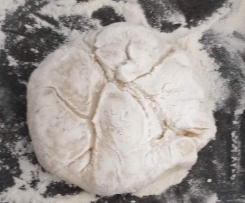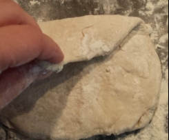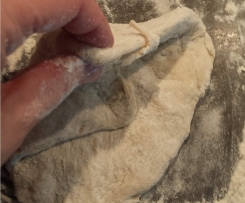 3. Um den Kartoffelbrötchen eine schöne Form zu geben werden diese "geschliffen". Dazu ein Stück Teig in der gewünschten Größe (ca. faustgroß) zu einer Kugel formen und auf einer gut bemehlten Fläche platt drücken, dann wird der Teig der Kugel von allen Seiten zur Mitte gefaltet. Anschließend wird das Brötchen umgedreht, und mit der hohlen Hand bringt man das Brötchen in eine schöne runde Form