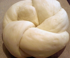 In der Zwischenzeit ein Backblech mit Backpapier auslegen. Ist der Teig soweit, knetet man ihn nochmals kurz durch und teilt ihn in 8 gleichgroße Teile. Diese formt man rund und dann zu jeweils einem Strang von 29 cm.