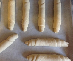 Die Kugel nach einander zu langen dünnen Zungen ausrollen (so wenig Mehl wie möglich dazu verwenden). Die Zungen aufrollen und dabei immer etwas in die Länge ziehen. Die Stangen/Stangerl auf ein mit Backpapier ausgelegtes Backblech legen.
