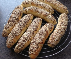 Um Salzstangen/Salzstangerl zu erhalten braucht ihr einfach nur grobes Salz, Sesam und Kümmel.