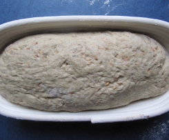Den Teig zu einem Brot formen und auf ein mit Backpapier ausgelegtes Backblech legen. Abgedeckt weitere 40 Minuten gehen lassen. Ich habe den Teig in ein Gärkörbchen gegeben....