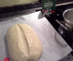 Nun bei vorgeheizten 200°C/30-40 min. bei Ober/Unterhitze backen. Bitte Augenkontakt halten. Nach ca 20 min nochmal mit der Natronlösung bepinseln. Nicht verwirren lassen: Das Brot wird aufgrund der Lauge beim Backen ja braun, das hat nicht wie sonst was mit dem Gargrad zu tun. Bitte Klopfprobe auf der Unterseite des Brotes machen: Wenn es schön hohl klingt, ist das Brot fertig!