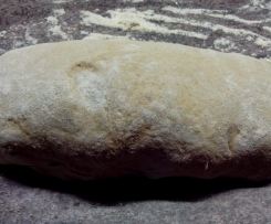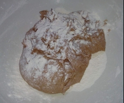 Nun den Teig auf einer bemehlten Arbeitsfläche gut durchkneten (Hände immer wieder bemehlen!)