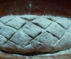 Brotlaib in den Römertopf legen und nach Wunsch einschneiden und nochmals leicht bemehlen.