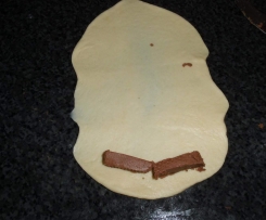 nehmen und kurz ruhen lassen.In 10 Teile teilen und zu Zungen ausrollen und mit ca 10g Nuggat belegen und zu einem Hörnchen aufrollen.