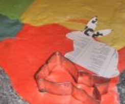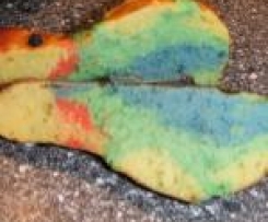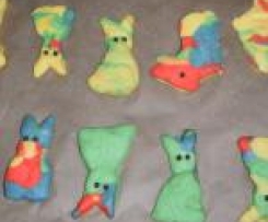 Eigentlich sollten es "Osterhasen mit Überraschungseffekt" werden - braune Hasen, die beim Aufschneiden innen bunt sind, aber leider sieht man die Farbe etwas durch die Lauge durch.