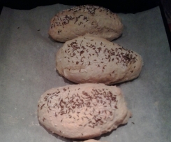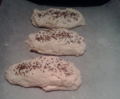 Nach Belieben mit grobem Salz, Kümmel, Speck, gerösteten Zwiebeln oder Käse bestreuen. - Bei 200°C Umluft im Ofen ca. 25 Minuten backen.