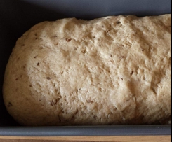 Den Teig in eine Brotbackform (geölt falls notwendig) geben, dann wieder mit Trockentuch abdecken und warten bis der Teig bis kurz über den Rand der Brotbackform gestiegen ist. Dauert wieder so ca. 1 Stunde.