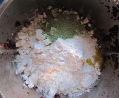 - Die vorher umgefüllte Hefemischung sowie Mehl, Salz und Öl hinzufügen.