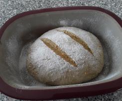 Im Ofenmeister, Tupper Ultra, Römertopf..... (gefettet und gemehlt) im kalten Ofen auf unterster Schiene bei 240° Ober- und Unterhitze ca 50-55 min backen, noch 5 min ohne Form nachbräunen (je nach Backofen)