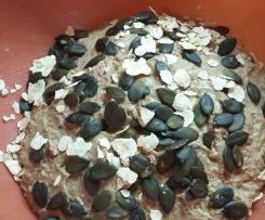 Der Teig ist weich und klebrig, hat aber dennoch eine kompakte Konsistenz. - Danach kommt er in die mit BTM eingepinselte und mit Flocken ausgestreute Form (ich hab die Silikonform von Tch..o genommen). Mit dem angefeuchteten Spatel streiche ich den Teig etwas glatt und bringe ihn etwas in Form. Nun mit den Saaten und Körnern und evtl. nochmals einigen Flocken bestreuen.