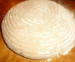 Noch einmal kurz und gut durchkneten, falten und zu einem Laib oder länglichem Brot formen. In Mehl wälzen und ins Gärkörbchen geben, nochmals 30 Minuten abgedeckt gehen lassen.
