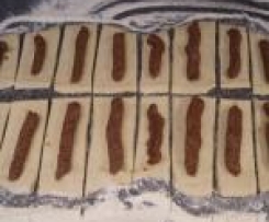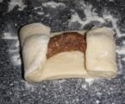 Teig ausrollen und mit dem Pizzaschneider in 12 - 16 Stücke schneiden. Füllung aufspritzen, den Teig gut schließen (auf Löcher achten, sonst tropft hier die Füllung heraus). Die Rollen aufs Backblech legen. Für den Glanz mit Kondensmilch - alternativ mit Eigelb - bestreichen und ca. 30 Minuten backen.