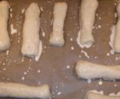 "Mixtopf geschlossen" - 10 Sek. / Stufe 10 mahlen. Dann Milch & Butter hinzufügen - 10 Sek. / Stufe 4 vermischen. Zum Weiterverarbeiten am besten in eine Plastiktüte füllen und eine kleine Ecke von dieser abschneiden - sozusagen als Spritzbeutel. Ofen auf 170° Heissluft vorheizen, dann können gleich beide Bleche gemeinsam gebacken werden.