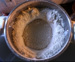 In die Mehlmitte eine Vertiefung machen und die Hefe hinein bröseln. mit 1 MB von dem lauwarmem Wasser und einem TL Zucker (oder Goldsaft oder Honig) kurz verrühren. Das Mehl vom Rand drüber stäuben und alles mit geschlossenem Deckel für 15 Minuten ruhen lassen. Dies ist ein Vorteig. Er hilft der Hefe sich gut zu entfalten.