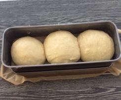 Währenddessen eine Kastenform einfetten. - Den Teig in 3 Teile teilen, zu Kugeln formen und nebeneinander in die Kastenform legen. Mit Margarine (oder Butter) bestreichen, abdecken und nochmals 30 Minuten gehen lassen.
