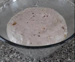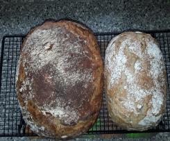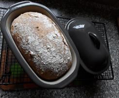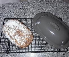 - Den Teig mehrfach falten, locker zu einer Rolle formen, nach Belieben mit Mehl bestäuben und einschneiden. Im kleinen Zaubermeister "Lily" (ggfs gefettet und bemehlt) weitere 15 min ruhen lassen. Im kalten Ofen auf der untersten Schiene bei 240° Ober- und Unterhitze ca 45 min backen. Noch 5 min ohne Form nachbräunen (je nach Backofen).