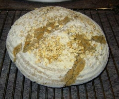 So, nun die Variante fürs freigeschobene Brot. Backofen auf 250° Ober/Unterhitze vorheizen. Das Brot nach dem letzten Falten statt im Römertopf im gut bemehlten und mit Haferflocken ausgestreutem Gärkörbchen 1 Std. gehen lassen. Dann vorsichtig auf eine mit Backpapier ausgelegtes Backblech stürzen und einschneiden. Einen halben MB Wasser auf den Backofenboden kippen und das Blech schnell in die 2. Schiene von unten schieben. nach 15 min. die Temperatur auf 180° drosseln und weitere 45 min backen. Der fertige Brot anschließend auf einem Gitterrost auskühlen lassen.