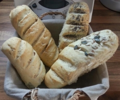 Alle Zutaten in den Mixtopf geben und 2Min./Teigkknetstufe kneten. Aus dem Teig 2 Baguette formen , mit lauwarmen Wasser bestreichen und bei 50 Grad im Ofen ca, 20 Min gehen lassen.