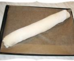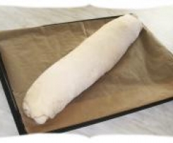 Den Teig zu einer Rolle aufrollen und auf ein mit Backpapier ausgelegtes Backblech legen.