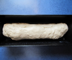 Teig in eine gefettete 30er Kastenform umfüllen und ca. 45 Minuten an einem warmen Ort gehen lassen bis die Form ausgefüllt ist.