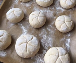 Den Teig auf eine bemehlte Arbeitsfläche stürzen, ebenfalls etwas mehlen und leicht flachdrücken. Nun in 9 gleichgroße Stücke teilen, zu Brötchen schleifen, mit einem Messer einschneiden oder mit einem Brötchendrücker eindrücken und verkehrtherum auf ein mit Backpapier (leicht bemehltes) Backblech legen.
