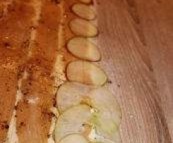 Den Apfel in 2 mm Scheiben hobeln und die Teigstreifen überlappend belegen. An der Stelle mit den kleinen Apfelringen beginnen die Streifen aufzurollen.