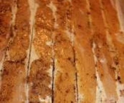 Marzipan dünn ausrollen und auf die Strefen verteilen. Das Marzipan dann mit Amaretto einpinseln und ca. 3/4 der Zuckermischung bestäugen.
