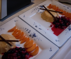 6--Dann die Förmchen kurz in heisses Wasser tauchen , das Aprikosen - Panna - cotta auf Teller stürzen. Die Beeren dazu anrichten .Mit Puderzucker darüber stäuben .