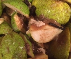 Zitronensaft, Vollrohrzucker (je nach Süße der Birnen variieren), halbe Vanilleschote, evtl. etwas Zitronenschale dazugeben