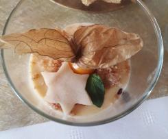 - Physalis geöffnet auf die Brösel setzen, ein Minzblatt daneben legen und die Sterne dagegen lehnen.
