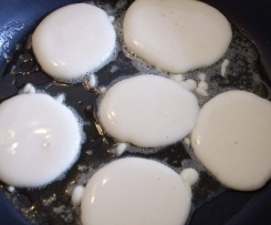 Anschließend den Teig esslöffelweise als kleine Klekse in das heiße Fett geben . So lange von einer Seite backen lassen, bis sich oben Bläschen bilden,danach wenden und die andere Seite ebenfalls braun werden lassen.