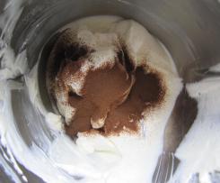 7. Den Mixtopf aus der Halterung nehmen und eine andere Schale hineinstellen. Die Waage auf Null stellen und 360 g der Creme hineinwiegen. Die 2 TL Backkakao hinzufügen und von Hand unterrühren.