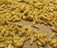 Die Mandeln auf Backpapier verteilen und abkühlen lassen. Die Zubereitung ist an dieses Rezept angelehnt: //www.rezeptwelt.de/desserts-rezepte/gebrannte-mandeln/24268. Vielen Dank dafür