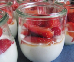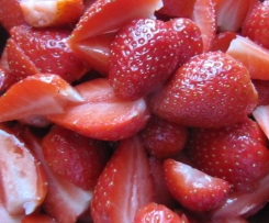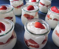 Neun Dessertgläser à 220 ml ca. zur Hälfte mit der Creme füllen und jeweils eine Schicht Erdbeeren darauf verteilen. Ich habe noch jeweils einen Teelöffeldes abgesetzten Amarettos über die Erdbeeren gegeben.