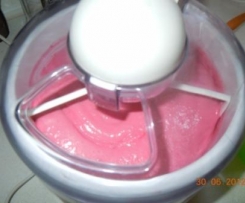 Rote Gelantine in kaltes Wasser ca. 10 Minuten einweichen. (Sorgt für eine cremige Konsistenz und gibt eine schöne rote Erdbeereisfarbe, welche durch die Eier eher bräunlich wäre.)