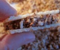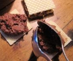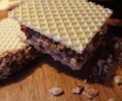 Die Waffelbrotscheiben immer mit dem Messer halbieren und mit zwei Löffeln Schokoladenmasse auf die eine Waffelseite geben. Die 2. Waffel obendrauf setzen und die Kanten in grob gehackten Nüssen wälzen. Die Waffeln einzeln in Alufolie verpacken oder in einer größen Tupperdose im Kühlschrank aufbewahren.