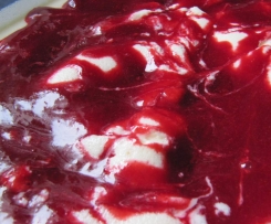 Das Himbeerpüree klecksweise über der Creme verteilen. Das Dessert in den Kühlschrank stellen bis die Creme fest ist.